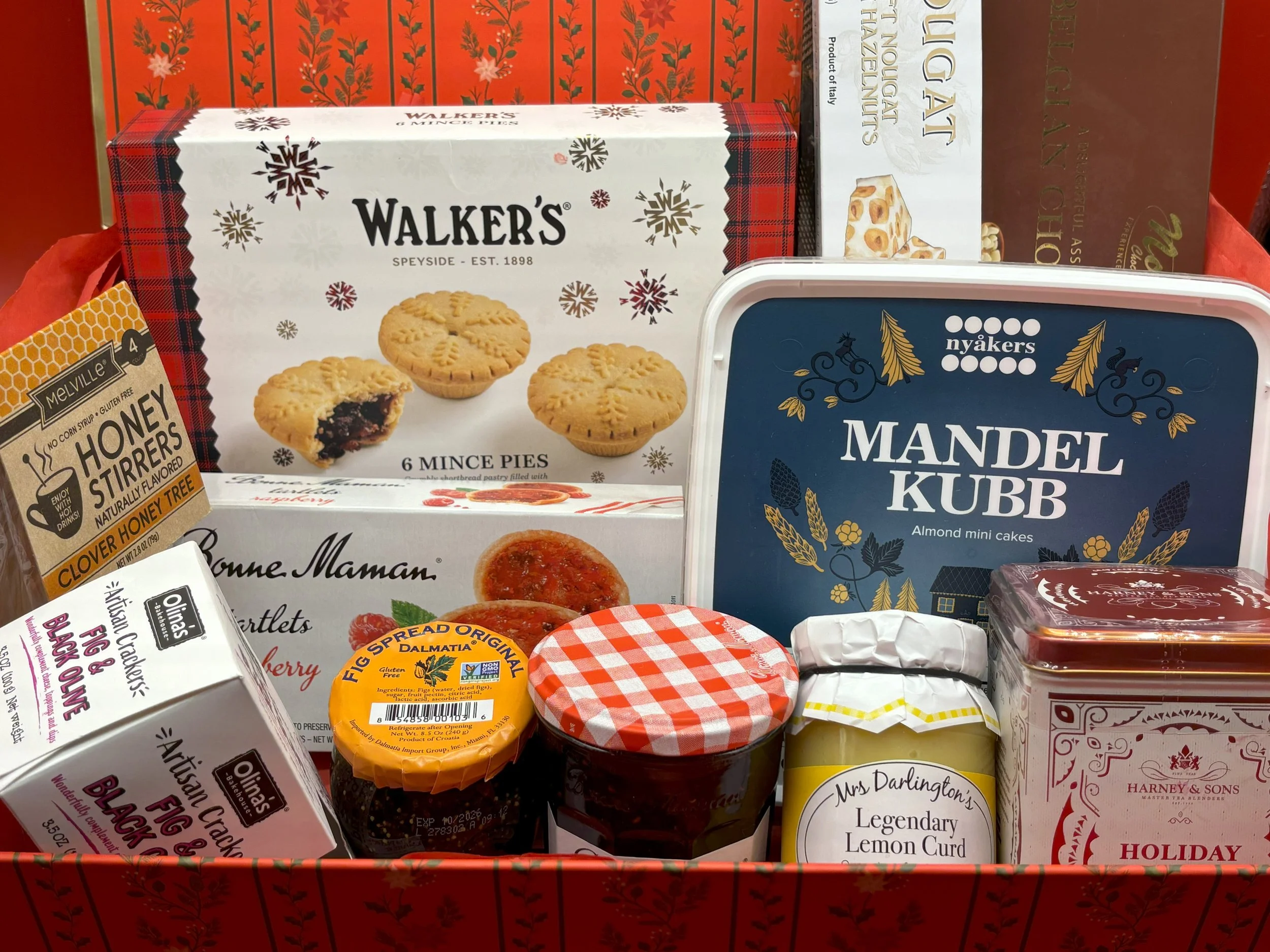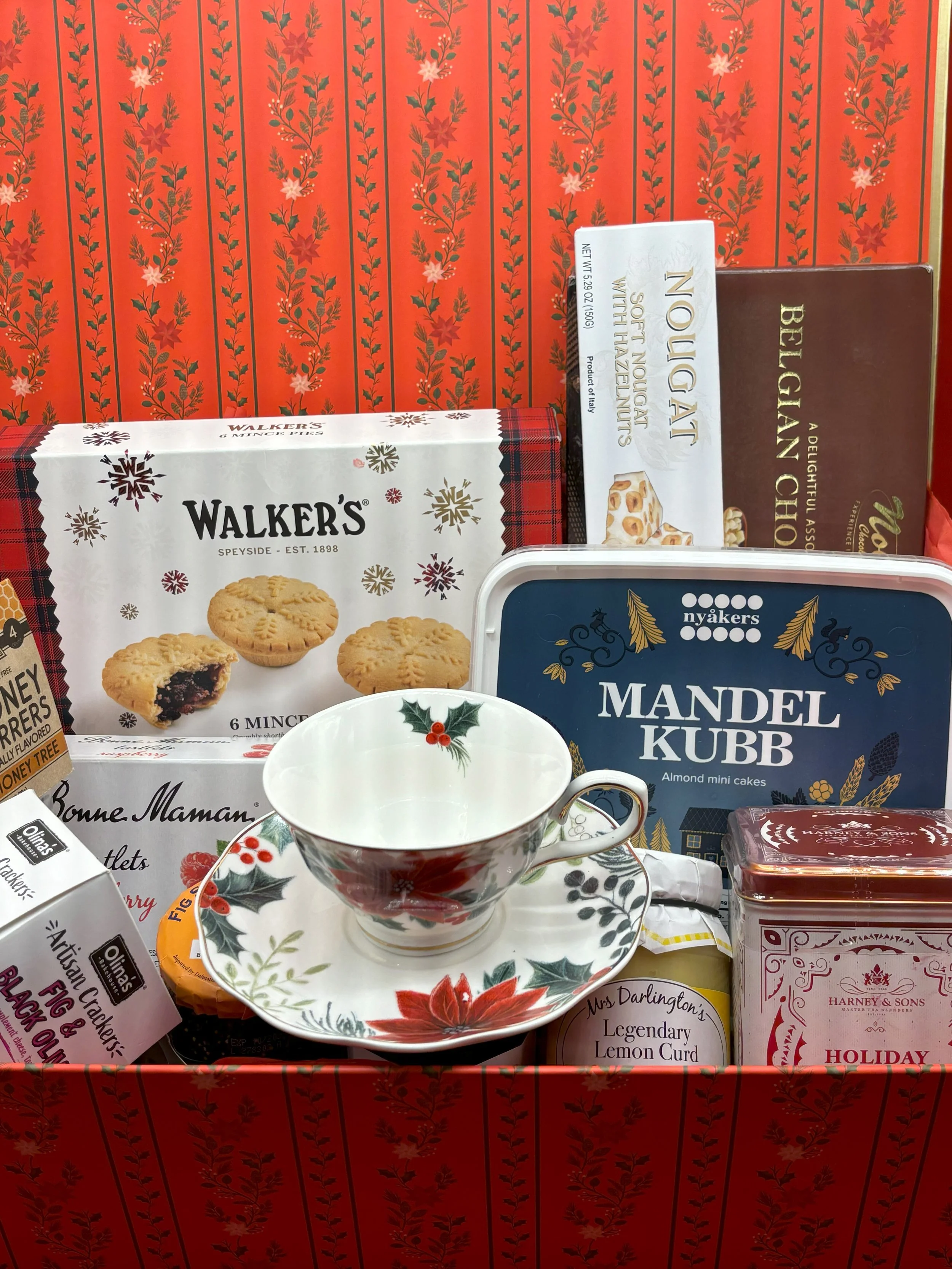 Winter Tea Service for 4! Includes Pandoro and panettone Cakes, Mince Pies, a selection of additional yummy treats, Strawberry Jam, Lemon Curd, Honey Spoons, Holiday Tea, and a Keepsake Storage Box. Please select desired treats below!